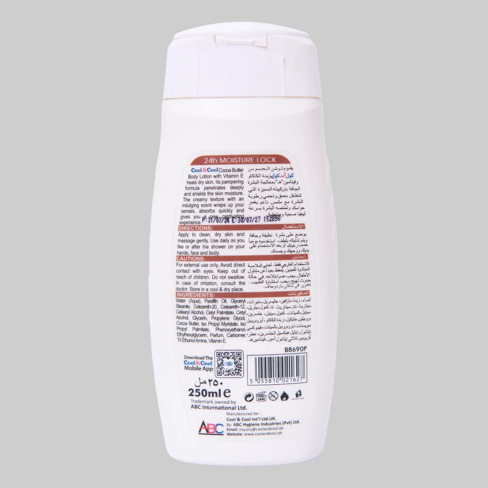 Cocoa Butter Body Lotion with Vitamin E heals dry skin. Its pampering formula penetrates deeply and shields the skin moisture. The creamy texture with an indulging scent wraps your senses, absorbs quickly and gives you a new captivating experience.