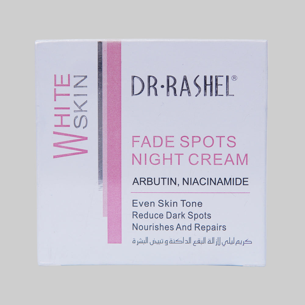 Contains arbutin and niacinamide ingredients, clinically proven to even out skin tone, reduce dark spots and discoloration for a brighter, more radiant complexion. Revives skin clarity and nurtures new skin cells. Moisturizes skin and delivers intense hydration, to soothe, repair and hydrate skin overnight, while natural active ingredients work to reduce areas of hyper pigmentation and discoloration. Introducing Dr. Rashel White Skin Fade Spots Night Cream, featuring clinically proven ingredients arbutin and niacinamide for a brighter, more even complexion. These powerful components work in tandem to reduce dark spots and discoloration, while nurturing new skin cells and reviving skin clarity. The cream's deep hydration properties soothe, repair, and moisturize skin overnight, all while containing natural active ingredients that specifically target hyperpigmentation and discoloration. Wake up feeling refreshed and rejuvenated with Dr. Rashel White Skin Fade Spots Night Cream.