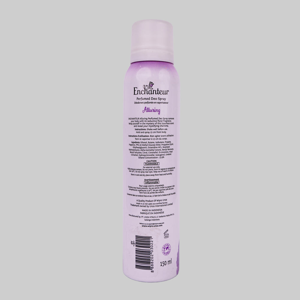 Enchanteur Alluring Body Spray Perfumed Deo Mist is another variant of the Enchanteur body mist line. Similar to the Romantic Body Mist, it typically comes in a 150ml spray bottle. The "Alluring" variant is known for its captivating and enticing scent profile, which may include floral, fruity, or musky notes designed to evoke a sense of allure and charm. This body spray is often used to add a refreshing fragrance to the body and is a popular choice for those looking for a long-lasting and pleasant scent experience throughout the day.