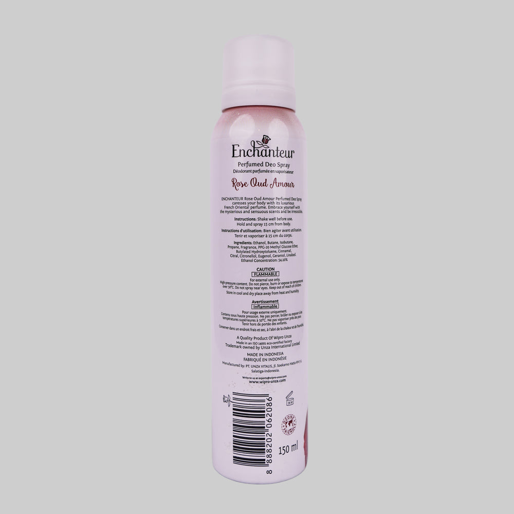 Indulge in the lovely scent of roses and oud with Enchanteur Body Mist Rose Oud 150ml. With just a spritz, this body mist will leave you feeling refreshed and smelling divine. Perfect for everyday wear or special occasions. Say goodbye to boring scents and hello to enchanting ones!"