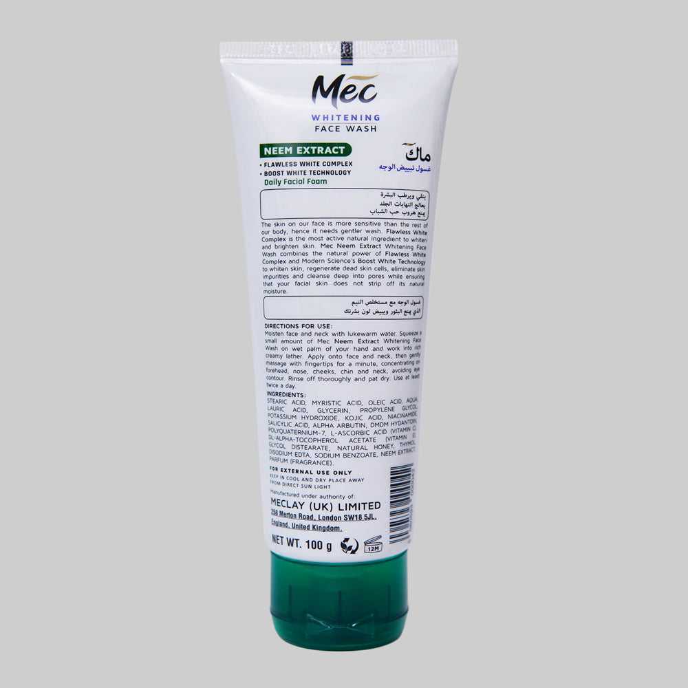 Mec Neem Extract Whitening Face Wash combines the natural power of Flawless White Complex and Modern Science’s Boost White Technology to whiten skin, regenerate dead skin cells. eliminate skin impurities and cleanse deep into pores while ensuring that your facial skin does not strip off its natural moisture.