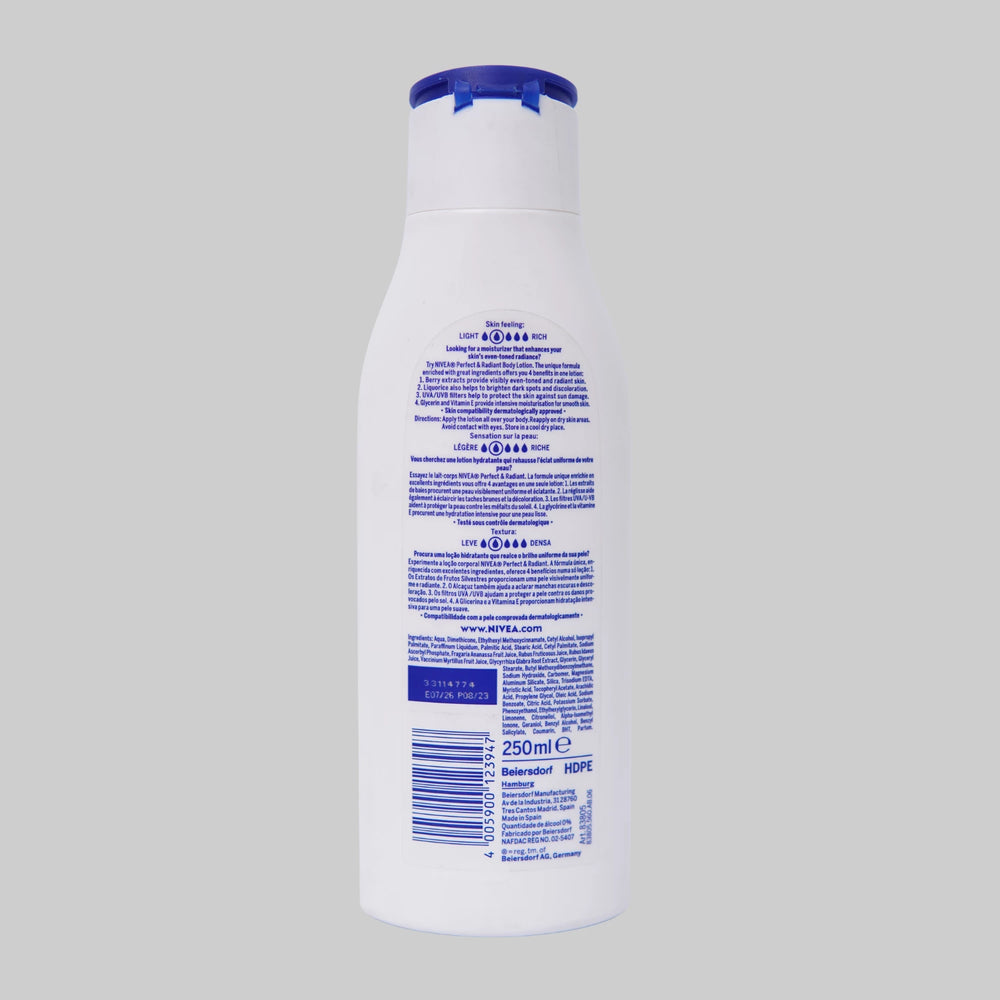 NIVEA Perfect & Radiant Body Lotion is a daily moisturizer developed to enhance the skin’s natural radiance. The innovative formula of NIVEA Perfect & Radiant Body Lotion gives the desired benefits via combined effect of the active ingredients. It works through two mechanisms: 1. Even toned skin by reducing or inhibiting overall skin pigmentation. Active ingredients added to the formula (licorice extract and Octadecenedioic acid) are known to facilitate even toned skin by acting on the melanin producing enzyme, tyrosinase. UV protection – The sunscreens added to the formula help in maintaining skin color by protecting skin from harsh UV rays thus protecting the skin from hyperpigmentation and future skin darkening.